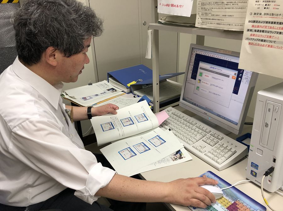石卷市水产技术综合中心,研究员正在测试海产品的放射性元素。