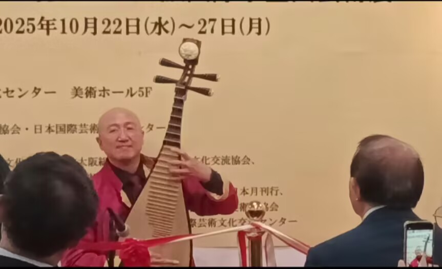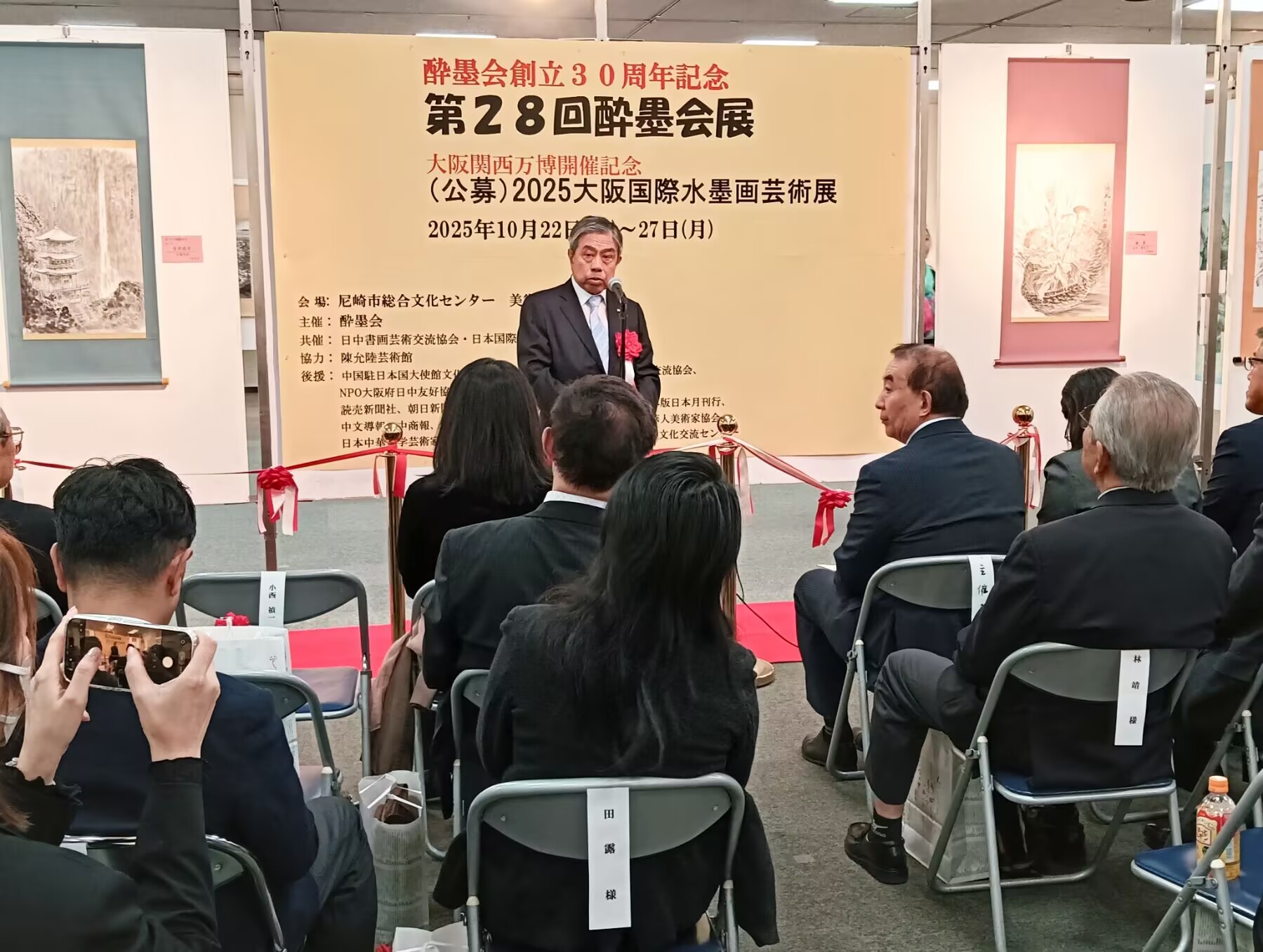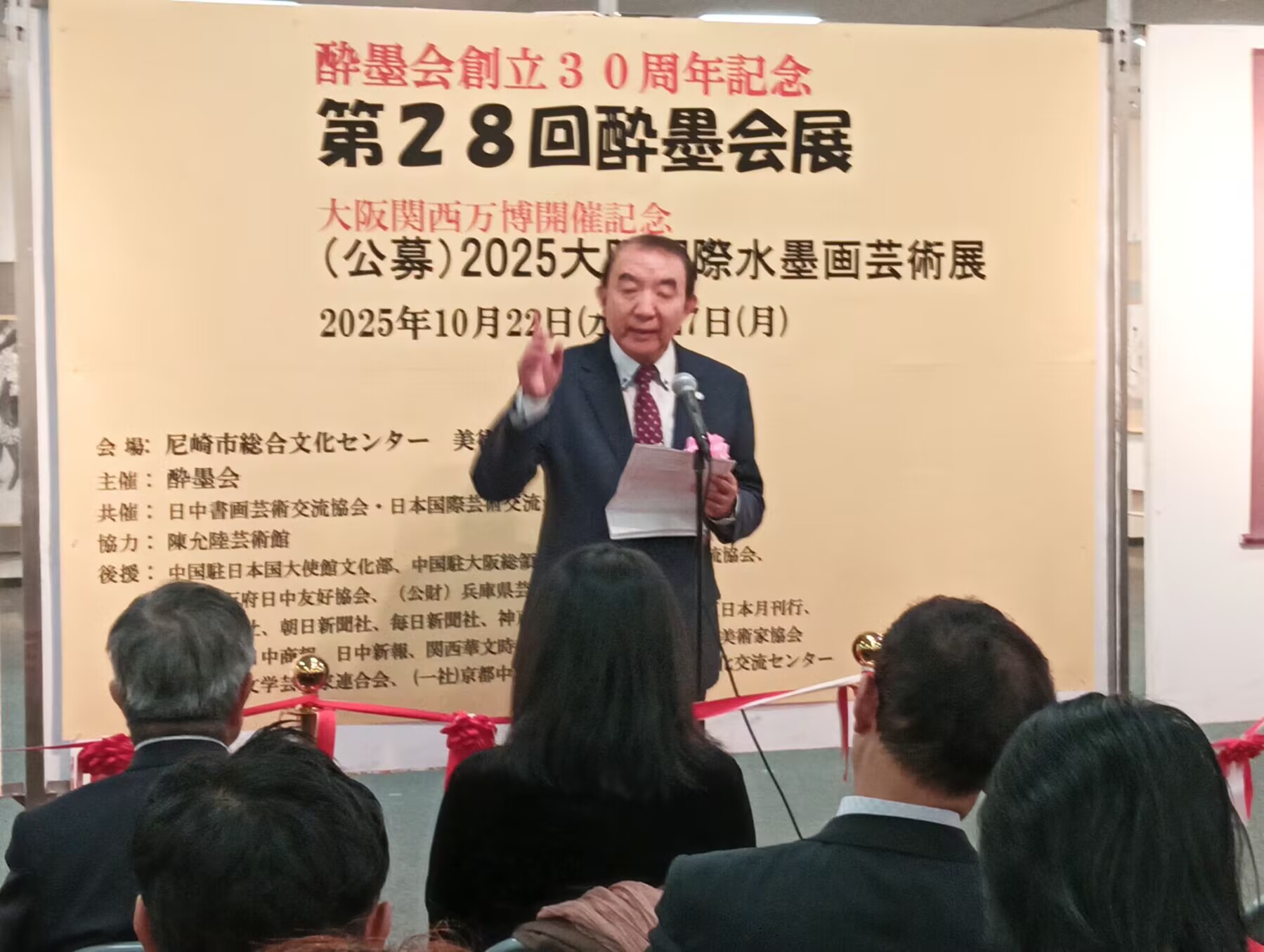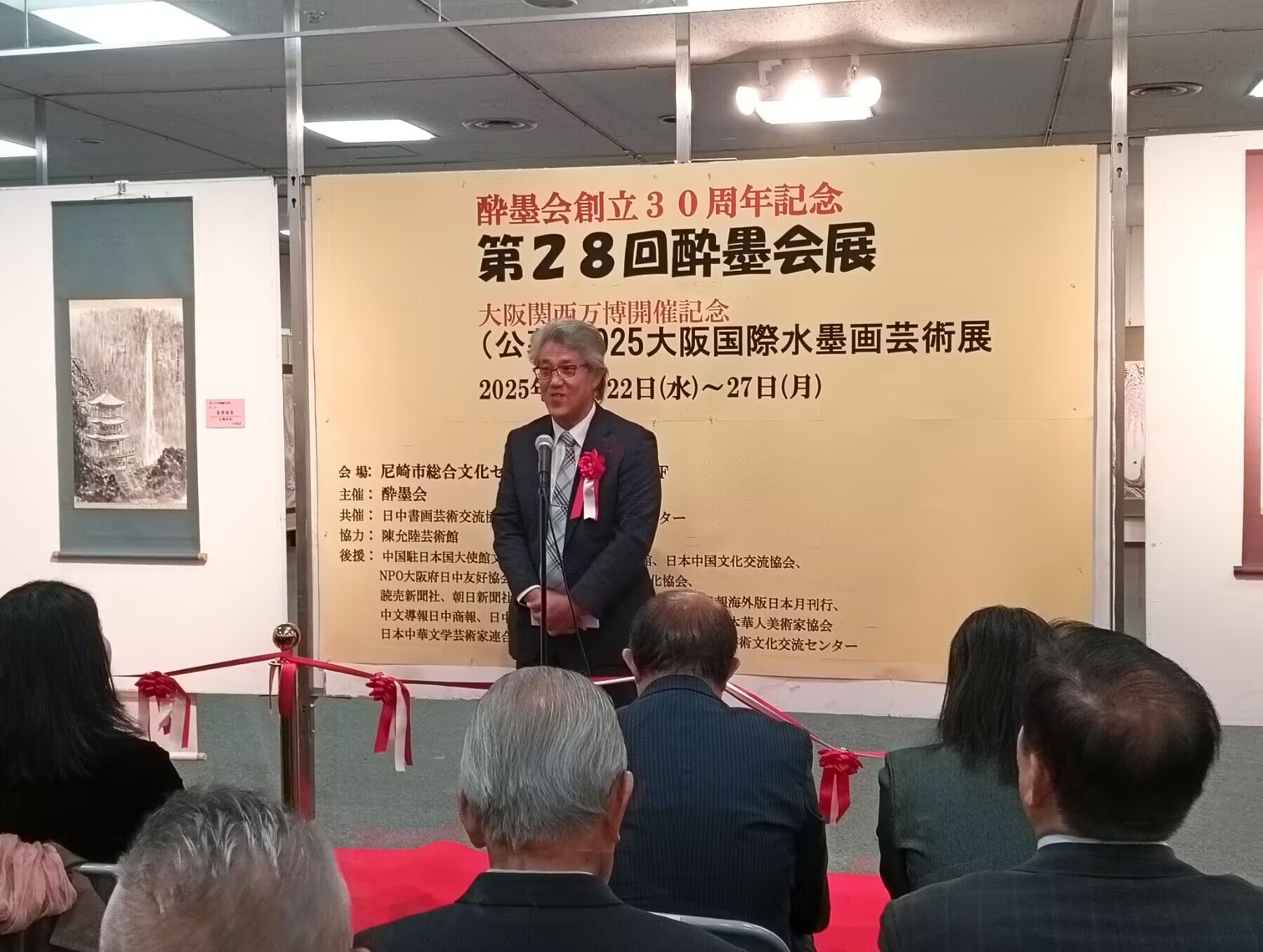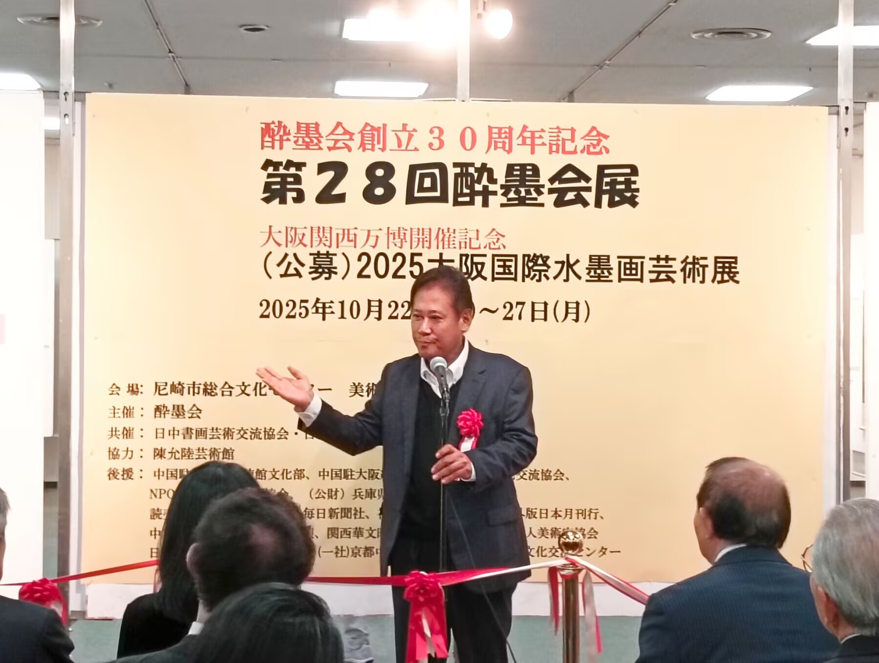 大阪華僑総会趙知理会長 在致辞中说:今天很高兴看到这么多艺术家和朋友聚在这里、庆祝第28回酔墨会展 2025大阪国際水墨画芸術展开幕,虽然不是重大活动,但是这样的艺术画展给中日之间的文化艺术带来了美好的氛围,带来平和友好的交流空间,希望一直延续下去。