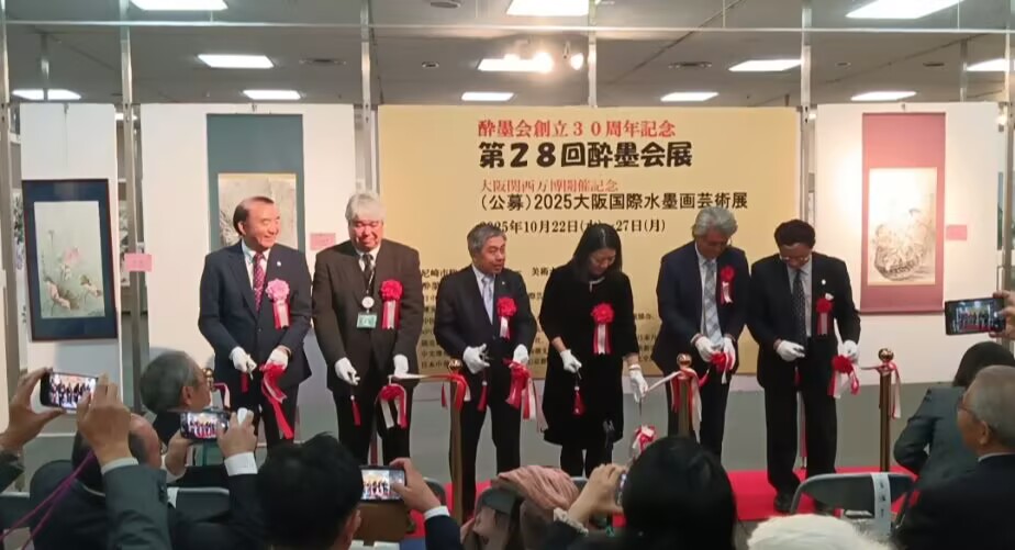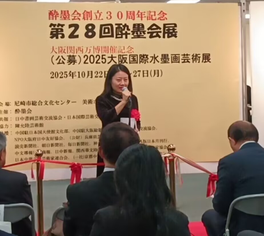 “值此大阪国际水墨画艺术展举办之际,我谨代表中国驻大阪总领馆,向多年来积极致力于推动中日书画艺术交流的醉墨会及日中书画艺术交流协会的各位同仁,表示衷心的敬意;衷心祝贺今日艺术展的举办。衷心祝贺发扬中国水墨画精神,促进中日水墨艺术交流的醉墨会成立30周年。中日两国的绘画艺术交流历史悠久,其开端是中国唐朝的水墨画传到遥远的、当时被称为扶桑的日本。日本艺术家还以其非凡的智慧和创造力,吸收和融合中国水墨画的精髓,创造出具有独特民族气质和审美意识的日本水墨画。声名远播的汉画派等正是如此,在东洋艺术的回廊上绽放着格外美丽的光芒。作为艺术界的独立语言,水墨画已经成为中日文化交流的强有力桥梁,见证了中日千年友好。中日关系虽然面临诸多挑战,但文化纽带始终紧密相连。作为两国共同珍视的传统文化艺术,水墨画交流的意义已超越艺术本身,承载着两国人民共同的和平友好愿望和对美好生活的向往。这样的文化艺术交流,必将拉近中日两国人民的心灵距离。”