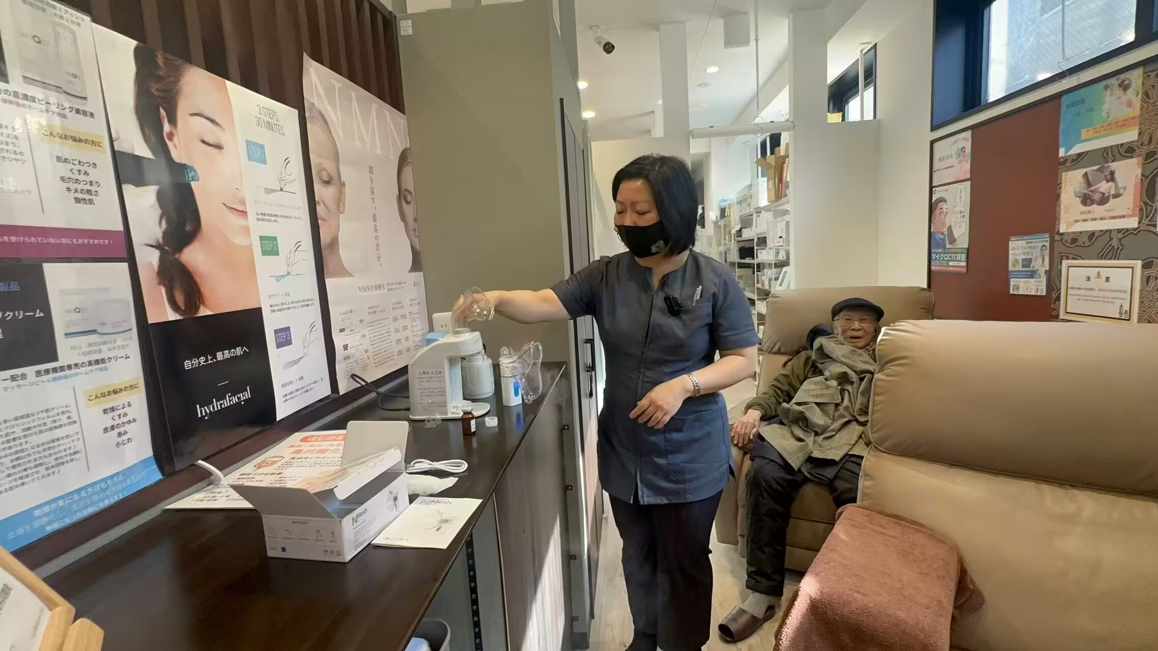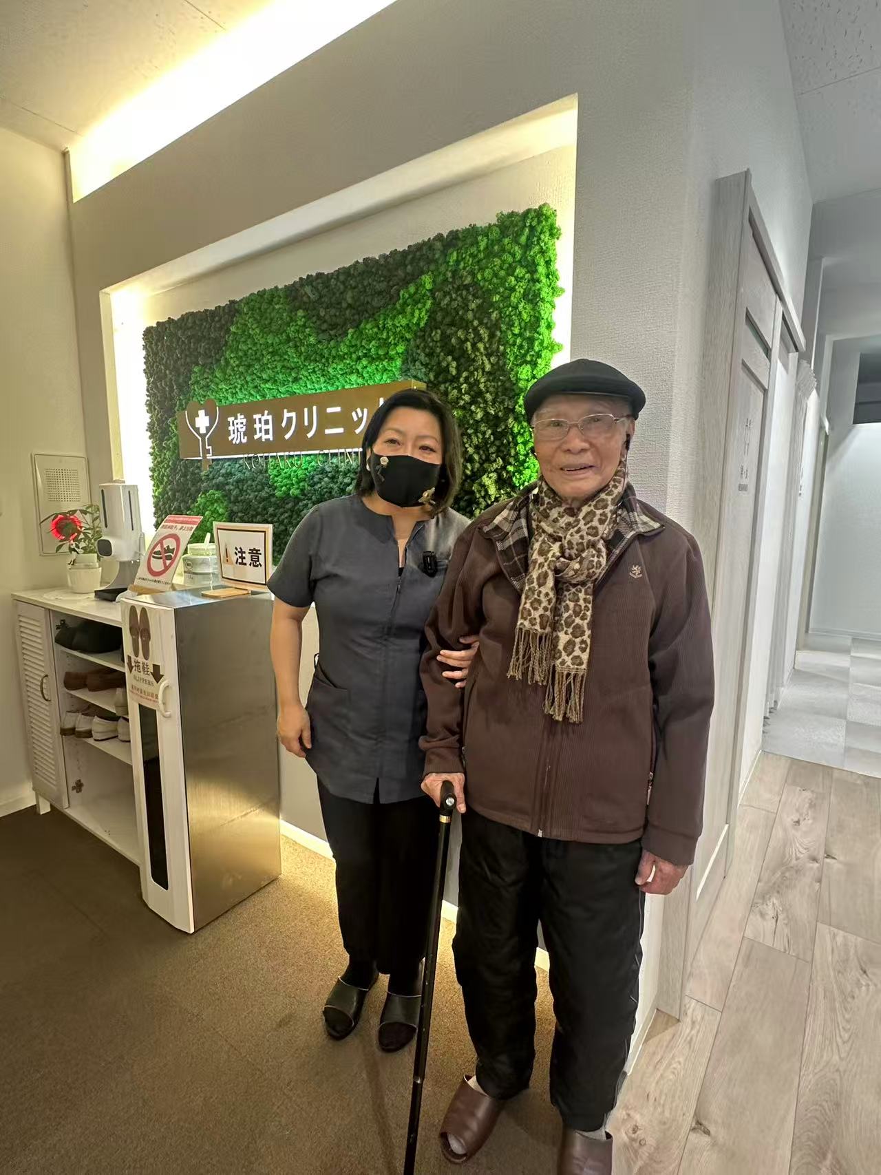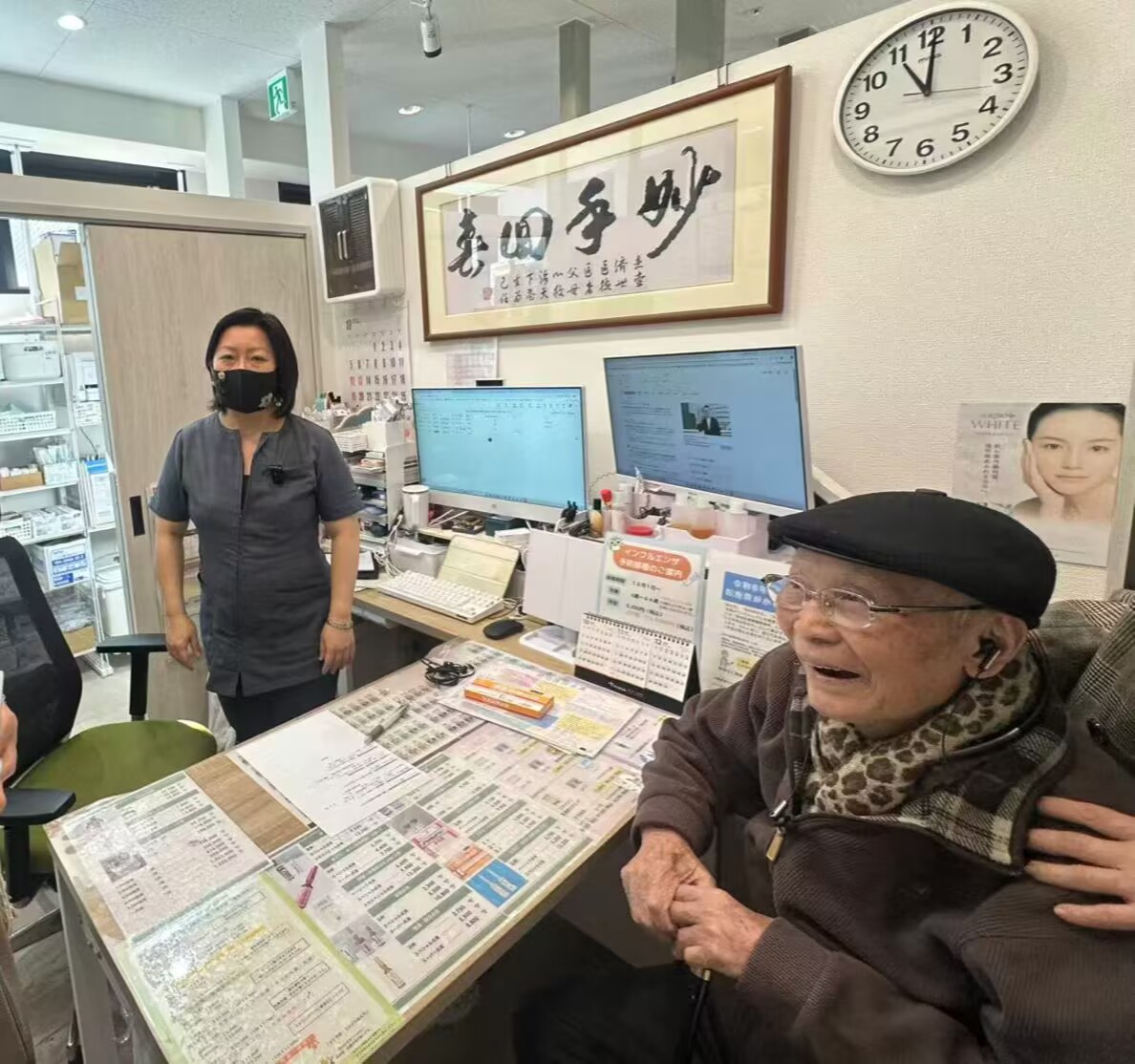 进门第一眼,见到了今天的主角:林院长的外公,106岁的高寿长者,在林院长妈妈的陪伴下,端端正正坐着,面色红润、慈眉善目,笑眯眯地看着我们。而林院长本人,第一直觉是:忙碌的空间里,在两国语言中迅速流畅地切换频道、在职员(日本护士)和患者之间,敏捷果断地做出回应。