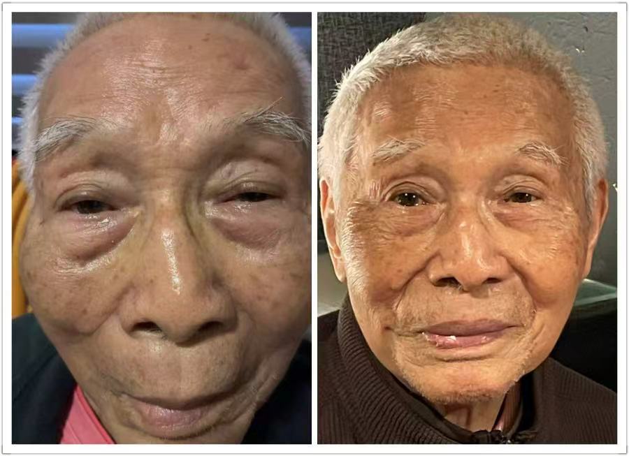 林院长说:这是外公9月16日,小脑梗刚治疗一段时间的照片,你看,消瘦的太阳穴都凹进去,下巴也变了形。右边是今天,恢复圆脸有肉了。而且,恢复成今天这个状态,没有一丝不快感和疼痛感,就是用我们大家都熟悉的感官上看到的“点眼药水”,或者喷雾呼吸就完成了“外泌体”诊疗,并短期见到疗效。