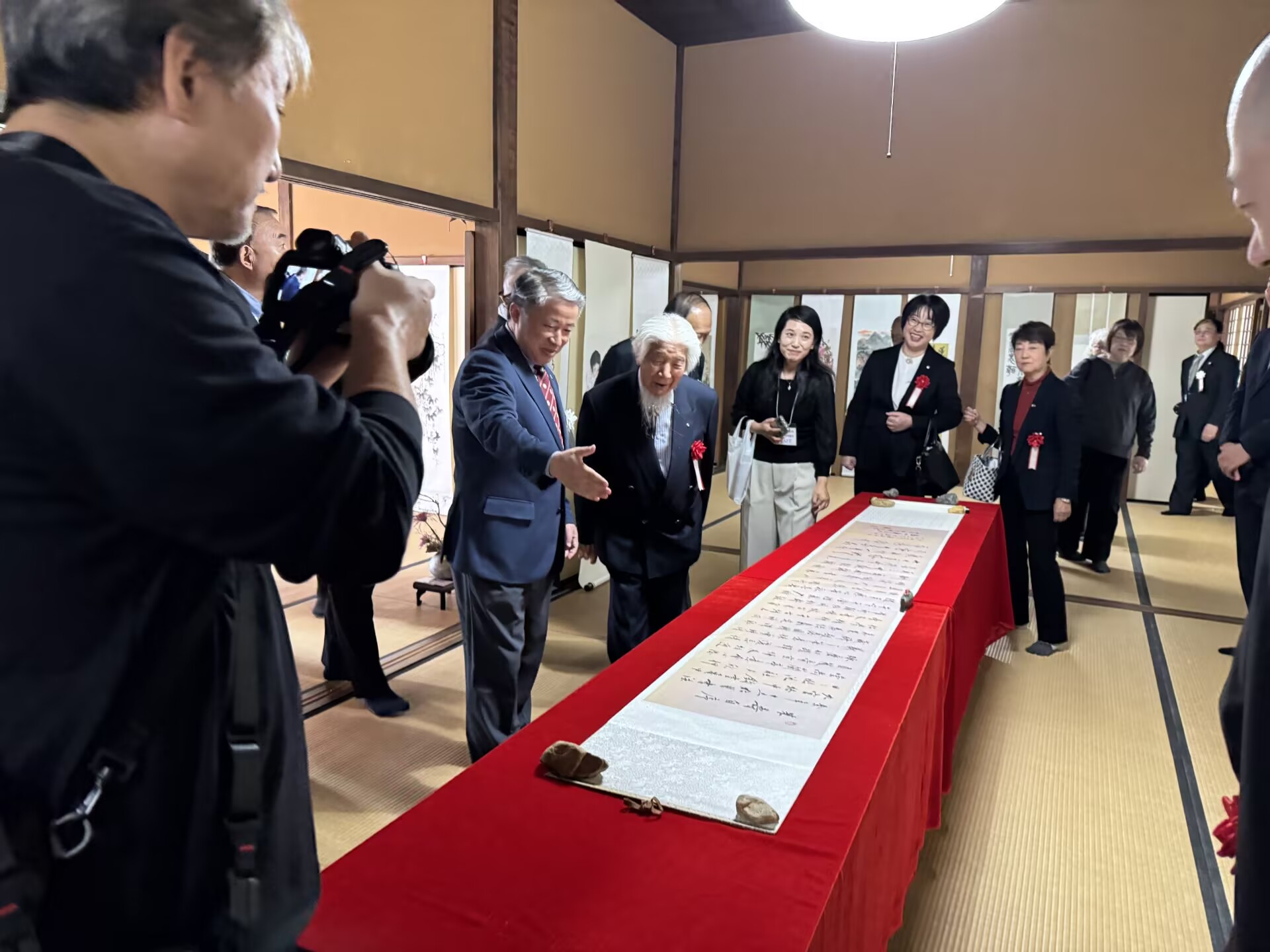 现场揮毫展示书画作品(右一近藤博道禅师、右二日本中華文学藝術家連合会謝春林前会长、左二陳允陸前会长、左一傅巍事務局長)