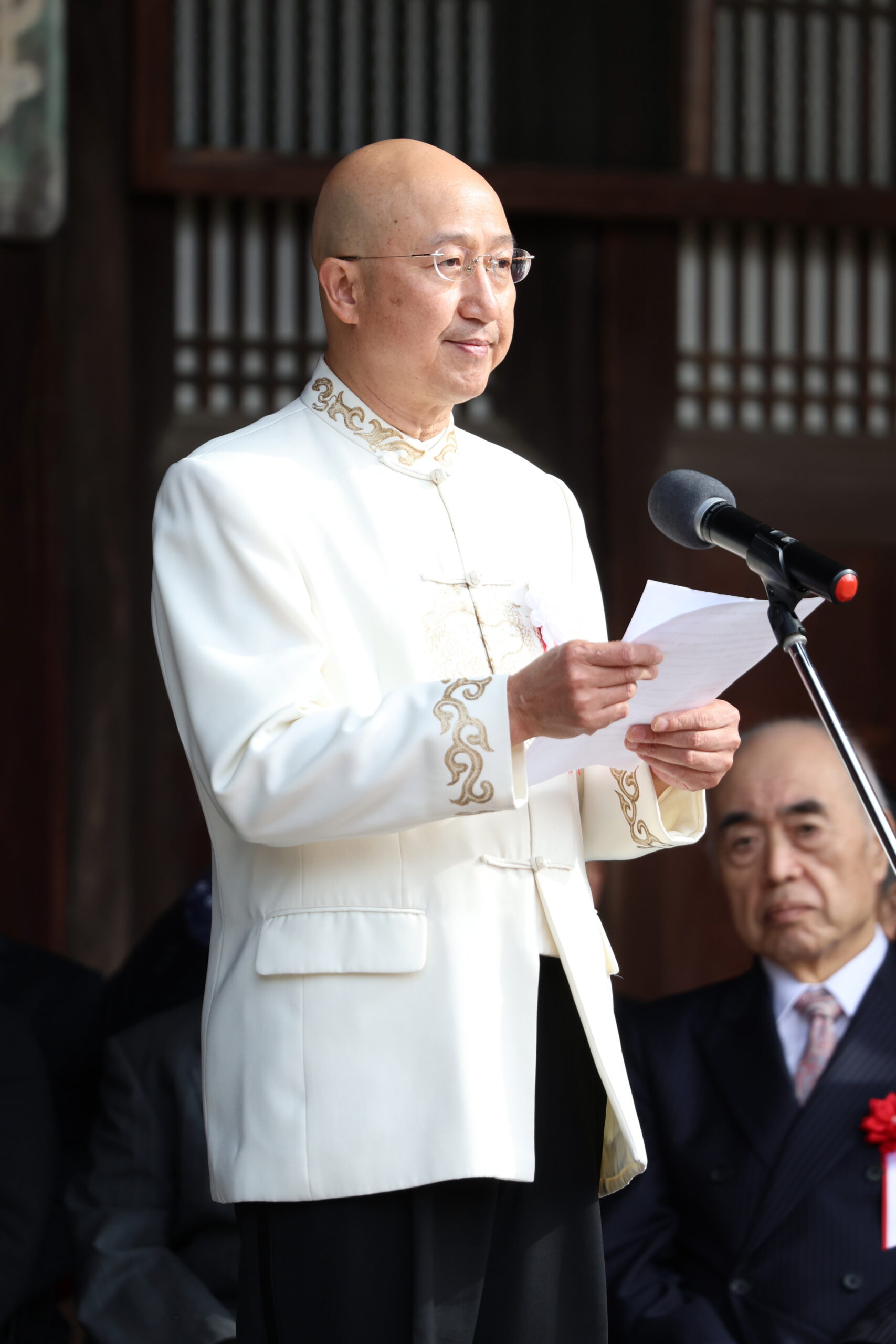 下午一点半,主持人张述洲和白雪梅在大雄宝殿前宣布:「第4 回日中文化芸術祭 IN 萬福寺 」開幕式、现场开始。介绍嘉宾之后,日本中华文学艺术家联合会会长葉衛陽首先致辞。
