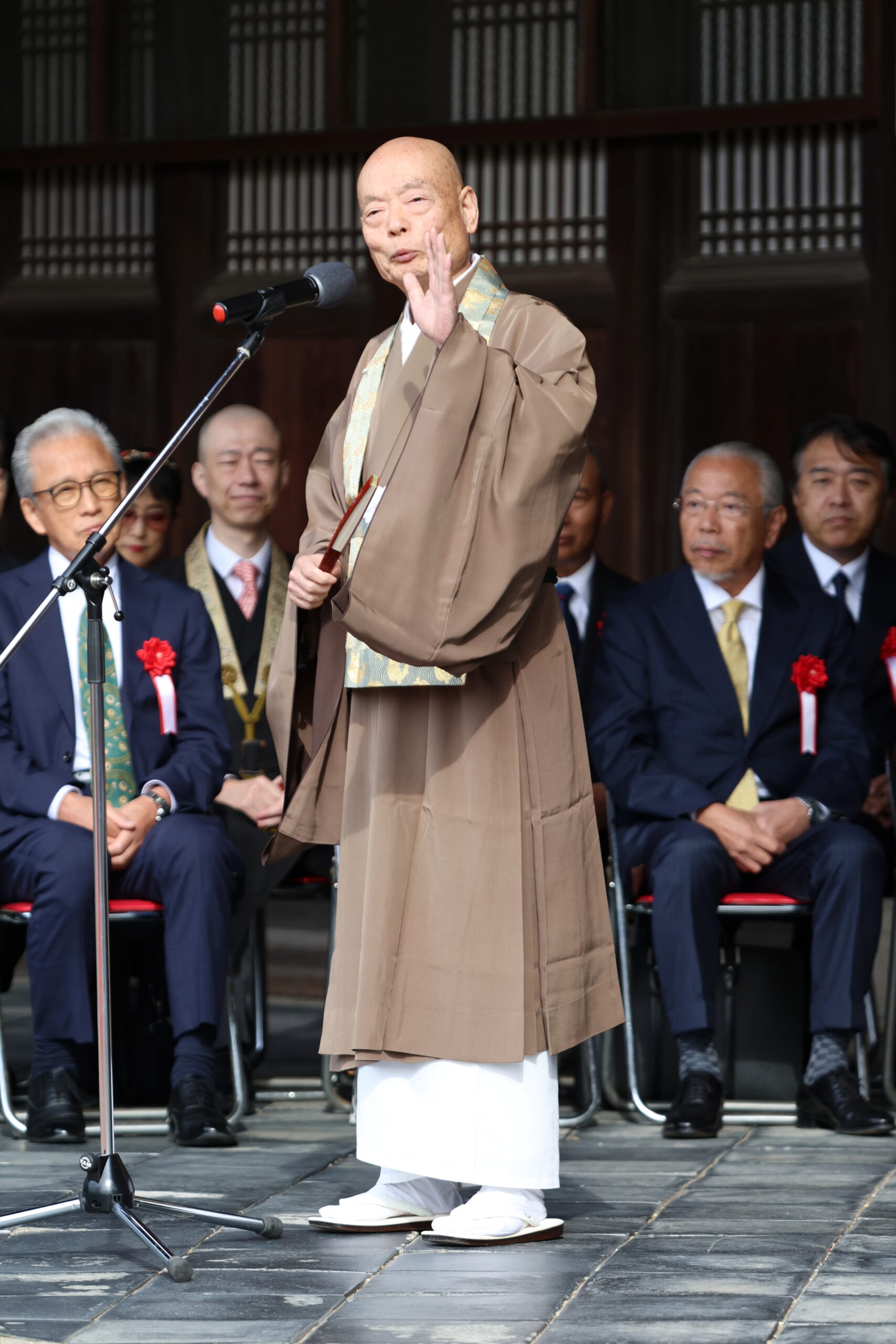 黄檗宗万福寺禅师近藤博道在致辞中说:今天第四回在日本宇治黄檗山万福寺此举办日中文化艺术祭有着特别的意义。370年前,隐元禅师东渡日本,开宗黄檗,对日本文化影响至深。他带来的不仅是禅宗思想,更是让日本黄檗成为煎茶道的发源地。今天的活动内容也有“禅茶一味”,“一味”就是纯净和纯粹的意思。“禅”就是排除杂念入静。这次的文化艺术祭,有书画展、音乐会,音乐,佛教中的音乐称“梵唄”,“梵”,意于纯净心灵;因此,“梵唄”即纯净心灵的音乐。希望大家都怀着纯净的心情,参加这次文化艺术祭,享受其中的快乐。